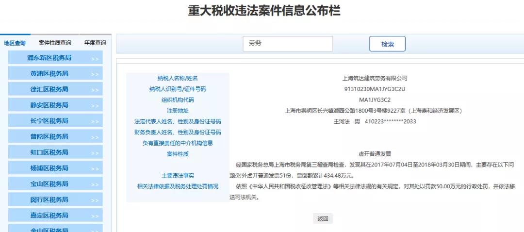 2、上海XX建筑勞務(wù)有限公司,經(jīng)國(guó)家稅務(wù)總局上海市稅務(wù)局第三稽查局檢查,發(fā)現(xiàn)其在2017年07月04日至2018年03月30日期間,主要存在以下問(wèn)題:對(duì)外虛開(kāi)普通發(fā)票51份,票面額累計(jì)434.48萬(wàn)元。依照《中華人民共和國(guó)稅收征收管理法》等相關(guān)法律法規(guī)的有關(guān)規(guī)定,對(duì)其處以罰款50.00萬(wàn)元的行政處罰,并依法移送司法機(jī)關(guān)。