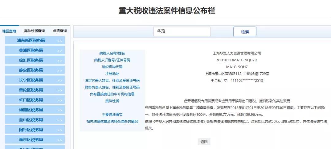 4、上海XX人力資源管理有限公司,經(jīng)國(guó)家稅務(wù)總局上海市稅務(wù)局第二稽查局檢查,發(fā)現(xiàn)其在2015年01月01日至2018年09月30日期間,主要存在以下問(wèn)題:對(duì)外虛開(kāi)增值稅專(zhuān)用發(fā)票共計(jì)100份,金額999.77萬(wàn)元,稅額159.96萬(wàn)元。依照《中華人民共和國(guó)稅收征收管理法》等相關(guān)法律法規(guī)的有關(guān)規(guī)定,對(duì)其處以罰款50萬(wàn)元的行政處罰,并依法移送司法機(jī)關(guān)。