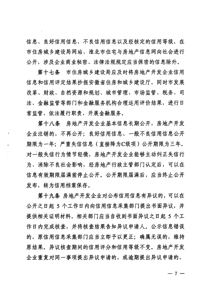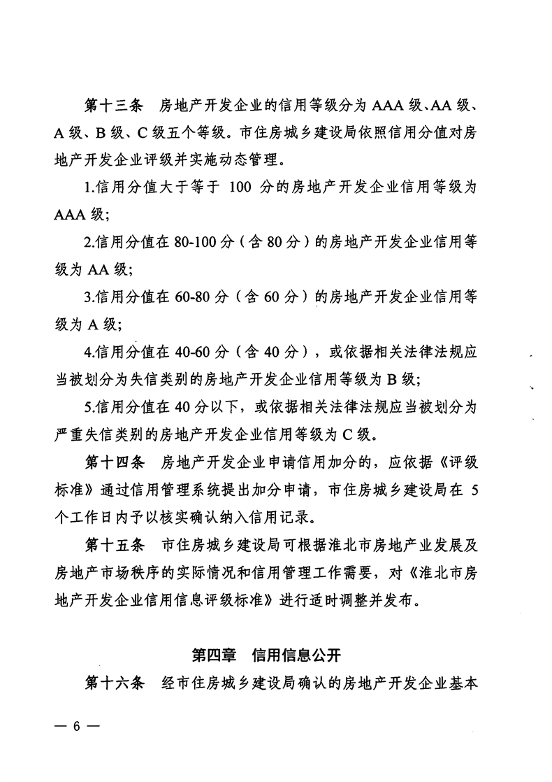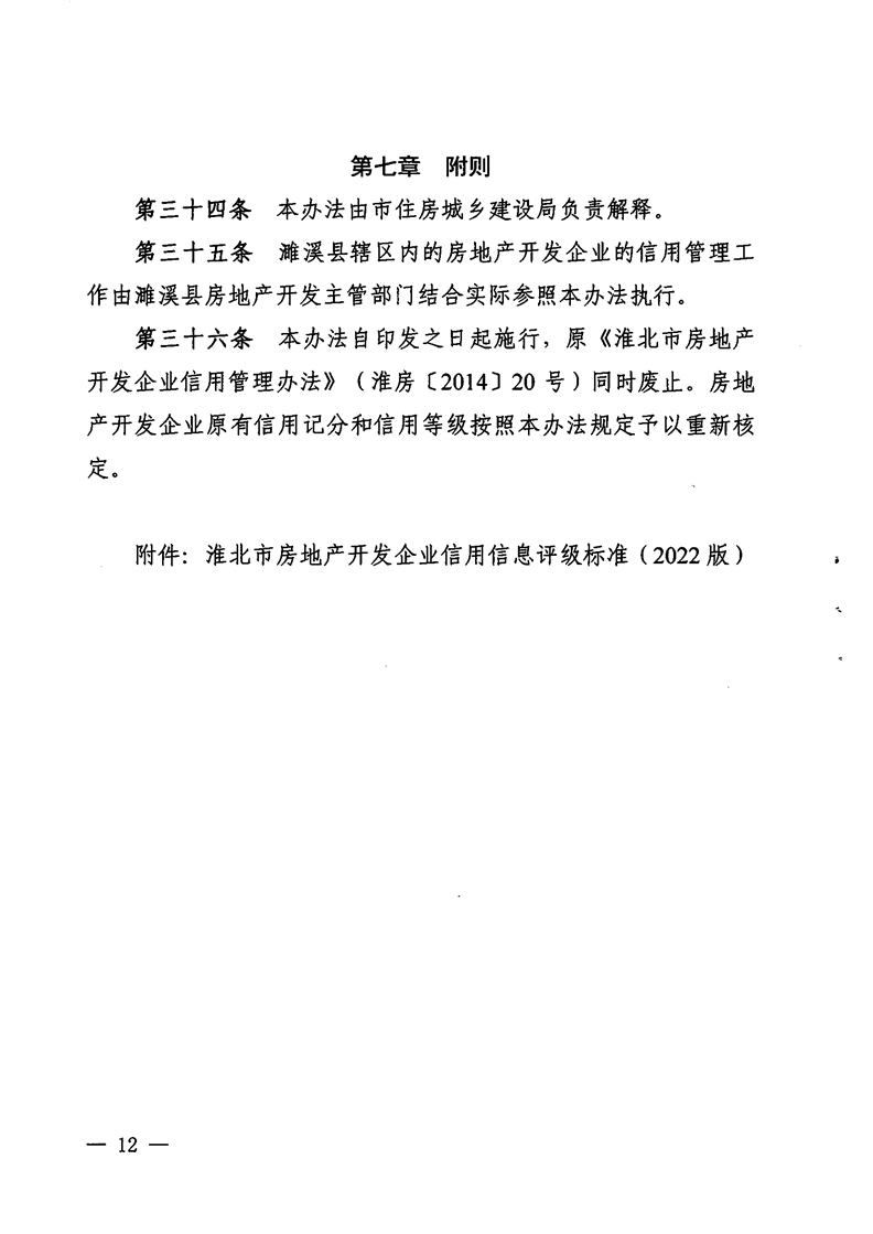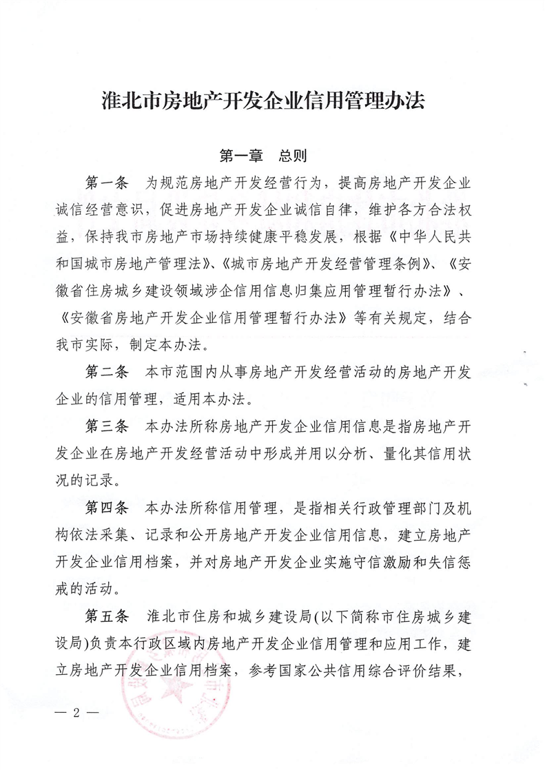 重磅消息!淮北市住房和城鄉建設局官網昨日發布關于印發《淮北市房地產開發企業信用管理辦法》的通知(淮住建規【2022】1號)文件,擬對開發商信用進行評級,并根據開發企業信用不同等級實施差異化管理,為規范房地產開發經營行為,促進房地產業持續健康穩定發展提供政策指引。具體內容如下: